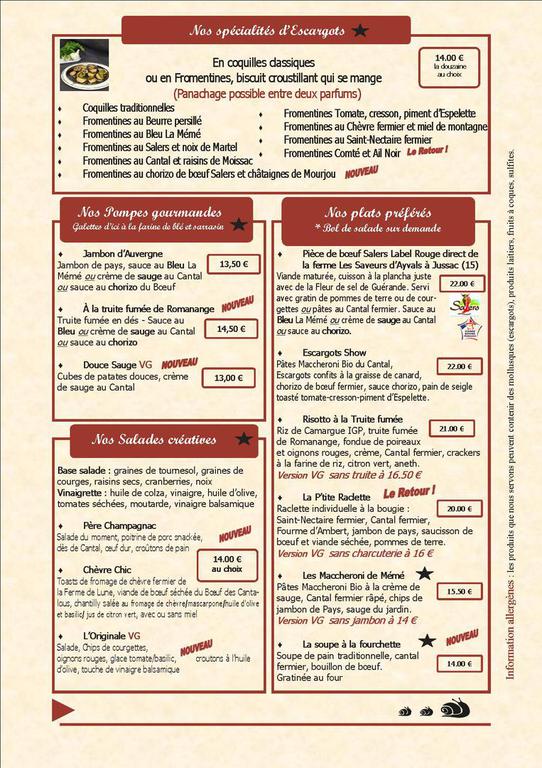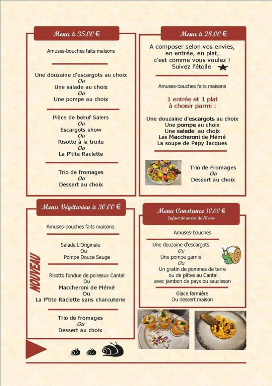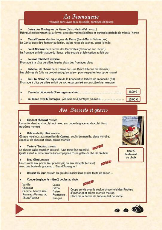 Eleveurs d’escargots depuis 2007, nous vous proposons une cuisine sincère et généreuse à la table de notre Ferme-Auberge. Vous pourrez déguster nos spécialités d’escargots aux saveurs originales mais aussi des bourriols garnis (galette traditionnelle de bé noir), salades inventives et gourmandes, viande Salers direct producteur à la plancha, risotto à la truite fumée, maccheroni du Cantal à la sauge, raclette aux fromages d’Auvergne, amuse-bouche et desserts maison…